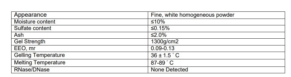 - 凝膠強度(1% 凝膠):1,365 g/cm2