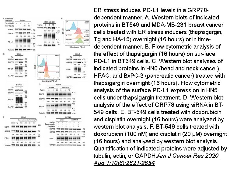 - Cheng-Wei Chou, Ri-Yao Yang, et al. “The stabilization of PD-L1 by the endoplasmic reticulum stress protein GRP78 in triple-negative breast cancer.” Am J Cancer Res 2020 Aug 1;10(8):2621-2634.PMID:32905506