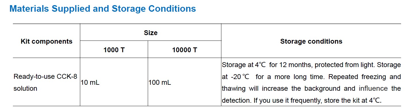 Features & Benefits | • One-bottle, ready-to-use solution. • The product (formazan) produced by WST-8 is water soluble, No organic solvents or isotopes required. And the formazan is stable and safe. • The detection sensitivity using CCK-8 is higher than assays using other tetrazolium salts such as MTT, XTT, MTS or WST-1. • The same cells can be used for other cell assays because of the low toxicity of CCK-8. |