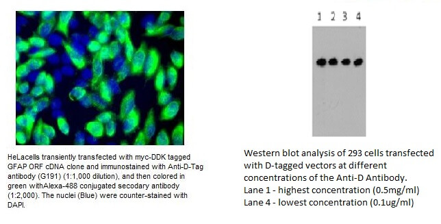 抗體特異性: 抗-D標籤抗體識別出轉染的哺乳動物細胞中含有與靶向蛋白質的氨基或羧基末端融合的D表位標籤的過表達蛋白質。免疫原為synthetic peptide (DYKDDDDK) coupled to KLH。D抗體辨視D tag融合蛋白。