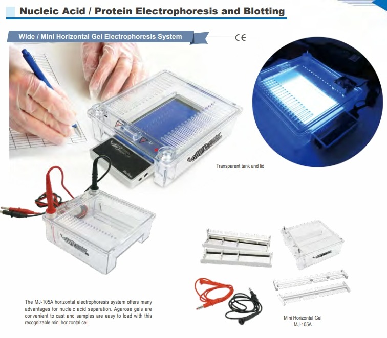 產品介紹: 迷你水平電泳系統, (貨號MJ-105A) MJ-105A水平電泳系統使您電泳更加輕鬆省時。製膠托盤(tray)側面具5 mm高度線,使倒膠時判斷膠體厚更加準確度。鑄膠台與托盤皆為單一壓模一體成形生產製造,可有效預防材質老化導致破裂漏膠,並可耐高溫達130°C,可節省您等待agarose冷卻時間,高溫時即可將agarose倒入鑄膠台,可有效改善在鑄高agarose濃度膠體時因冷卻不均造成電泳時DNA條帶移動速度不均;此外有多種不同款式齒梳(comb)可供選用,小片膠 (寬5.2 cm)最多可達12 個well,大片膠(寬10.7cm)最多可達25個well。特別改良後的槽體,僅需約180 ml TAE或TBE buffer即可滿足一般厚度膠體電泳需求,為您節省buffer,減少電泳開始前發現buffer不夠要稀釋或重配的尷尬狀況。全透明的槽體與上蓋,搭配加大的底部空間,可插入MBE300,在電泳過程中可搭配琥珀色filter (580 nm)即時觀察電泳狀況,為您節省篩選clone、專一性引子PCR鑑定、回收小片段DNA等實驗的時間,也可以準確判斷大片段DNA是否成功分開,以免切膠回收時被大小相似片段汙染,此外可搭配觀察用紙製遮光罩,可用手機直接拍照,為您節省購買照膠系統的經費。安全連鎖罩設計有效防止電泳過程中觸電。此產品可用於多種分生實驗如北方墨點法 (Northern blot),南方墨點法 (Southern blot),Cosmid文庫限制分析 (Cosmid library restriction analysis),STS篩選 (STS screening),微衛星分析 (microsatellite analysis),PCR片段分析 (PCR fragment analysis ),RFLP分析,DNA finger-printing和高通量分析。