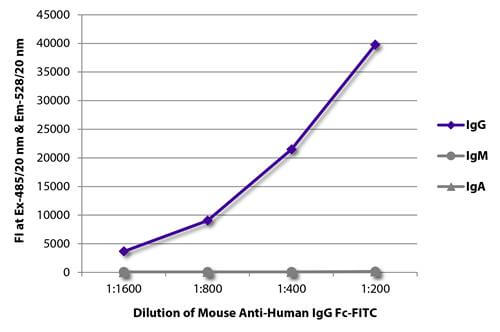 FLISA plate was coated with purified human IgG, IgM, and IgA. Immunoglobulins were detected with serially diluted Mouse Anti-Human IgG Fc-FITC (SB Cat. No. 9042-02).