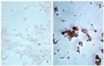 Non-infected and influenza A virus infected cell line was stained with Mouse Anti-Influenza A, Matrix Protein-HRP (SB Cat. No. 10730-05).