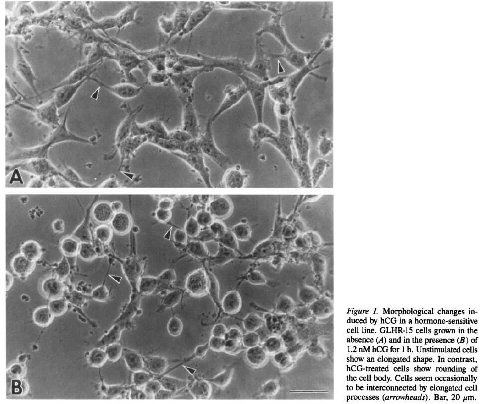 產品介紹: 永生化大鼠類固醇顆粒細胞穩定表達LH / CG受體(GLHR-15)Immortalized Rat Steroidogenic Granulosa Cells stably expressing LH/CG Receptor (GLHR-15) Lutropin / choriogonadotropin(LH / CG)受體是在卵巢顆粒和睾丸之睾丸細胞中獨特表達的受體,在卵子發生,精子發生和類固醇激素產生的調節中起著重要作用。不幸的是,LH / CG受體表達通常在原代細胞的體外培養後1-2天內丟失。穩定表達LH / CG受體的永生化大鼠類固醇顆粒細胞,對黃體生成激素(LH)或絨毛膜促性腺激素(hCG)刺激有反應,結果產生孕激素和20α-OH-P,其水平與原代細胞相當。該細胞株可用於研究與促性腺激素刺激的類固醇生成相關的分子機制。研究人員可以與表達FSH受體的永生化大鼠類固醇顆粒細胞(貨號T0605)一起,比較同源細胞系統中LH和FSH信號傳導。