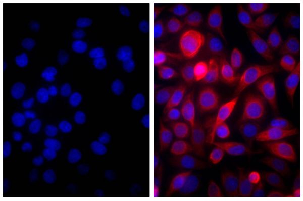 人胰腺癌細胞系 MIA PaCa-2 用 10% 正常山羊血清(SB 目錄號 0060-01)封閉,並用小鼠抗細胞角蛋白 18-UNLB(SB 目錄號 10085-01;右)染色,隨後通過山羊抗小鼠 IgG(H+L)、人 ads-AF555(SB 目錄號 1031-32)和 DAPI