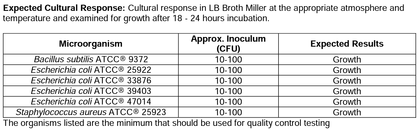 預期的培養反應:Bacillus subtilis ATCC® 9372、 Escherichia coli ATCC® 25922、 Escherichia coli ATCC® 33876、 Escherichia coli ATCC® 39403 、 Escherichia coli ATCC® 47014 、Staphylococcus aureus ATCC® 25923 在適當的氣氛和溫度下在 LB Broth Miller 中進行培養反應,並在孵育 18 – 24 小時後檢查生長情況。