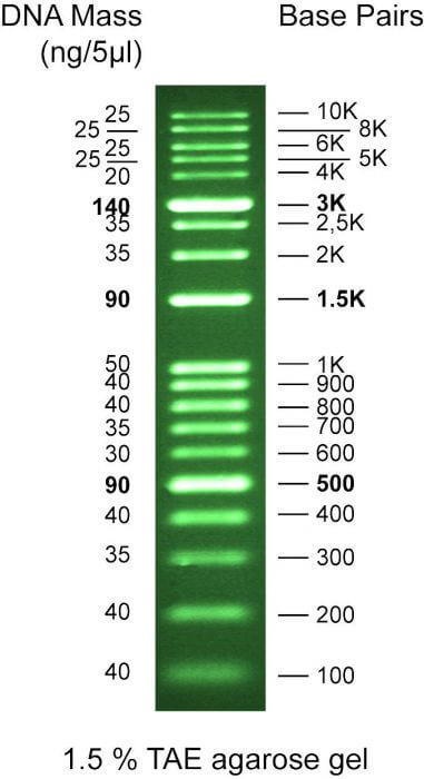 產品介紹: Safe-Green™Opti-DNA標記, 具有50-1.5kb範圍之DNA標準分子量(標準分子量包括100bp、200bp、300bp、400bp、500bp、600bp、700bp、800bp、900bp、1000bp、1500bp、2000bp、2500bp、3000bp、4000bp、5000bp、6000bp、8000bp、10000bp等19條band),標準液在500、1000、3000個鹼基對帶的強度增加,可以用作快速參考點。此標準液已包含Safe-Green™DNA染料,使用時不需再外加核酸染劑。Safe-Green™Opti-DNA標記在螢光亮度進行了優化,與abm Safe-Green™2X PCR MasterMixes以及其他SYBR Green-like的PCR具兼容性。