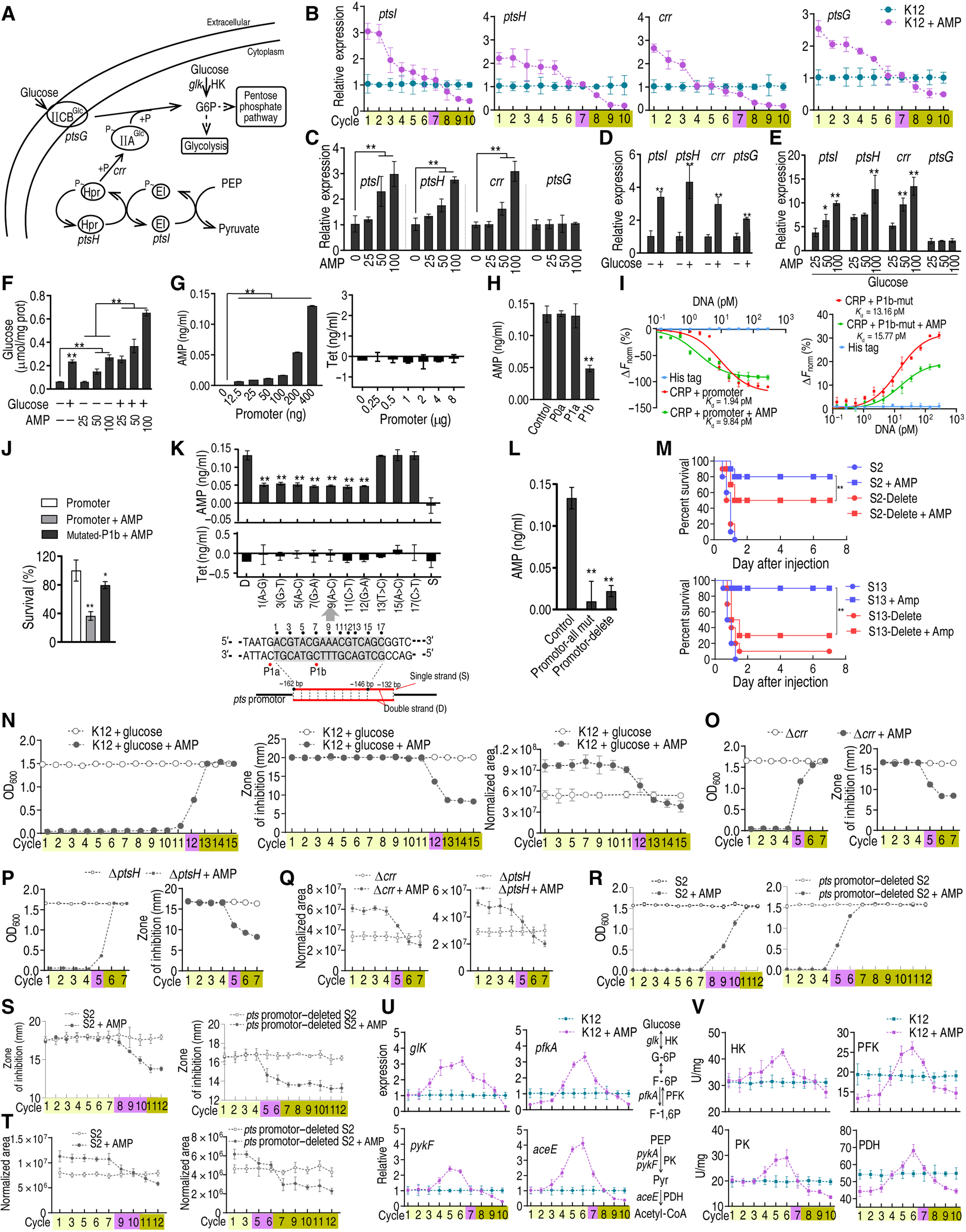(A) Diagram for glucose transport. (B to E) Gene expression of ptsI, ptsH, crr, and ptsG (n = 3) at indicated cycles (B), AMP concentration (C), 4 mM glucose (D), or both (E). (F) Intracellular glucose concentration (n = 3) exposed to AMP or/and 4 mM glucose.