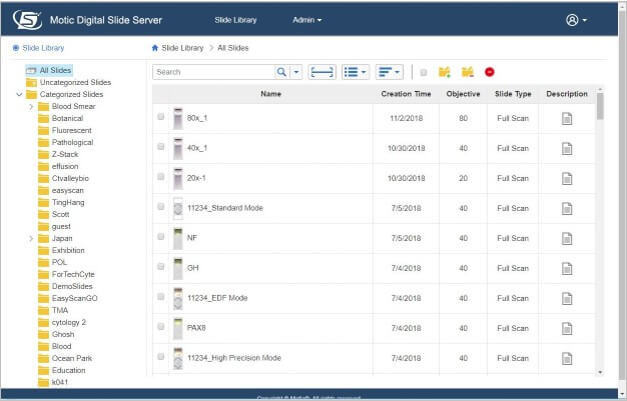 - DSServer雲端平台搭配Motic全系列玻片掃描儀,從玻片掃描、雲端儲存備份到遠端多人線上瀏覽,構成一個完整的數位切片工作站,有效提升工作效率,使病理切片的保存、教學或診斷不再受時間空間的限制。