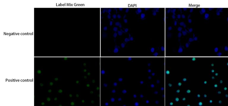 Fig.3 TUNEL Apoptosis Detection Kit (Green Fluorescence) was used to detect the apoptosis effect of HeLa cells after apoptosis induction.