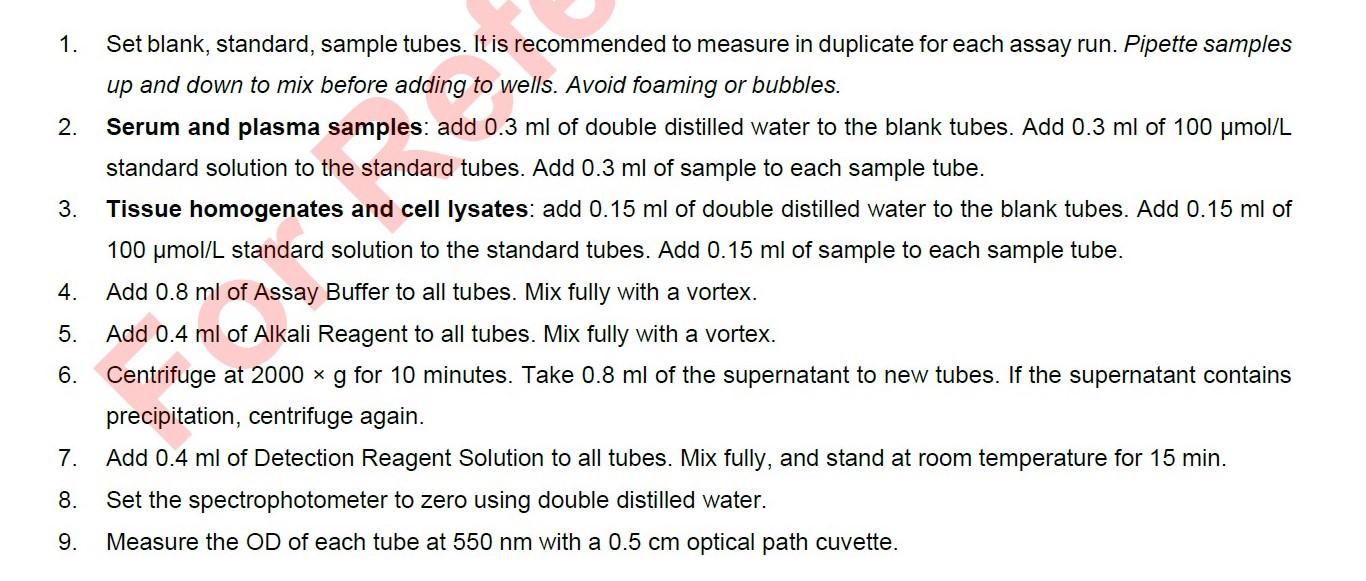 - 組織勻漿(Cell lysates)稱取 0.02-1 g 組織並用預冷的 PBS 清洗。每 1 g 組織加入 9 ml 預冷生理鹽水 (0.9% NaCl) 或 PBS (0.01 M, pH 7.4)。手動、使用機械均質器或通過超聲波均質。在 4°C 下以 1500 x g 離心勻漿 10 分鐘。收集上清液並立即測定。上清液中的蛋白質濃度應單獨測定。