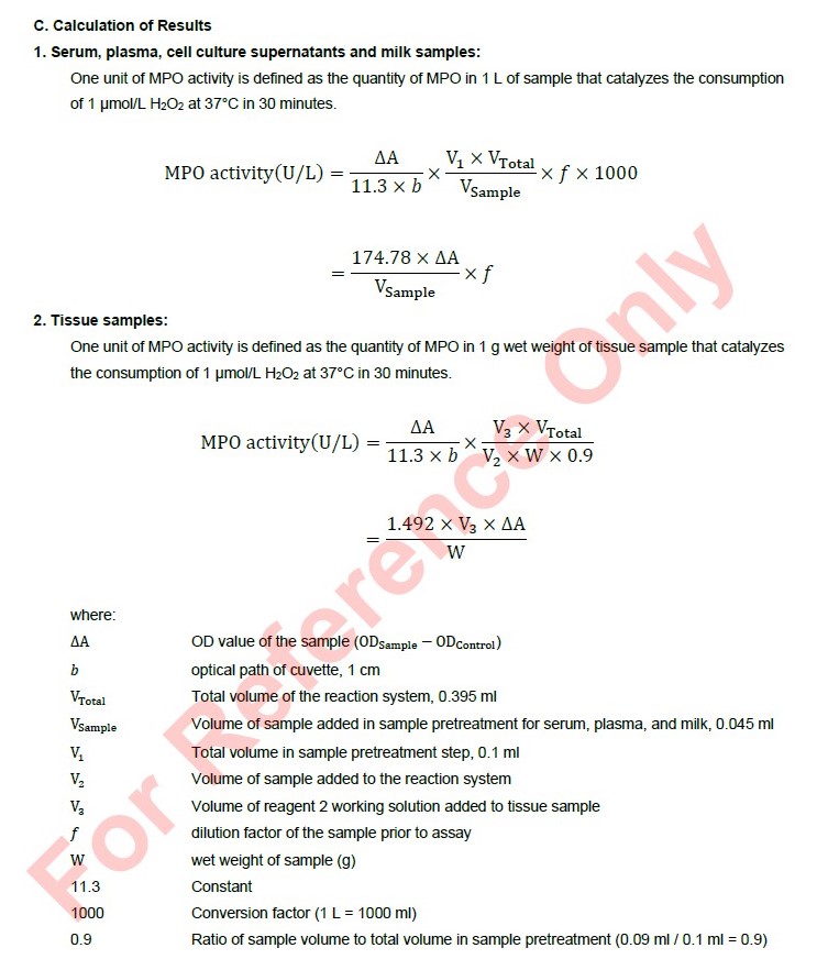 For detection and quantification of MPO activity in serum, plasma, milk, cell culture supernatants and tissue samples
