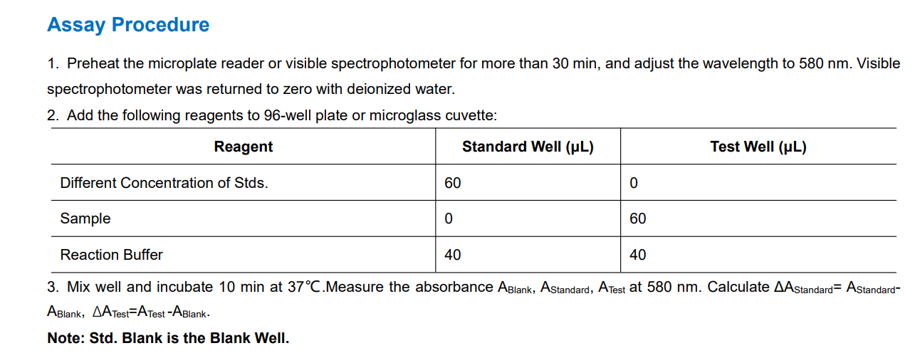 Usage notes | • It is recommended to perform several dilutions of your sample to ensure the readings are within the standard value range. • Fresh samples are necessary for good results. If not assayed immediately, samples can be stored at -80°C for one month. |