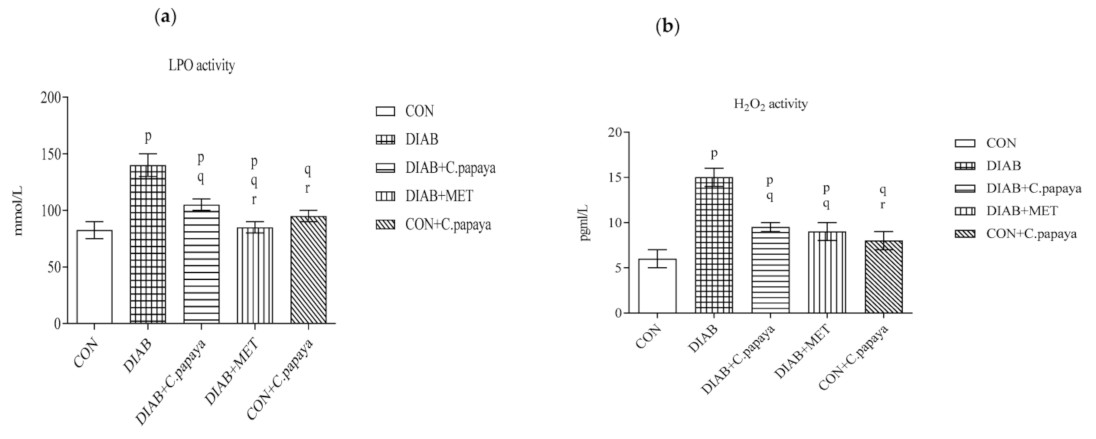 (文獻引用) Outcome of C. papaya on the oxidative stress marker levels in the control and treated rats. Each bar depicts the mean ± SEM of eight rats, with p < 0.05 designating statistically significant differences between the groups as follows: p—control; q—diabetes; r—T2DM rats + C. papaya.