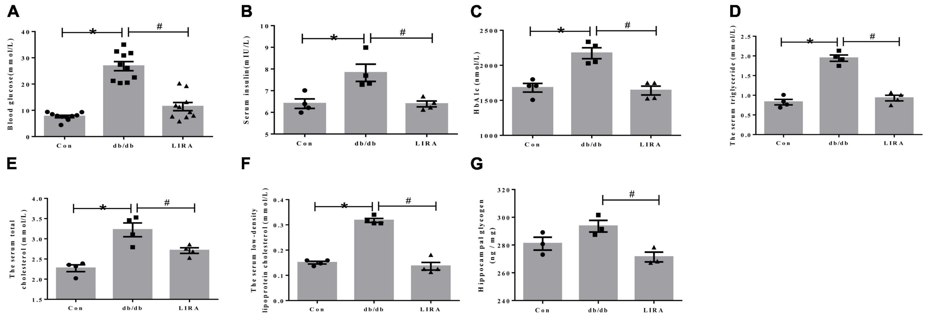(引用文獻) Figure 1. Liraglutide improves abnormal glucose and lipid metabolism in db/db mice. (A) Fasting blood glucose of mice (n = 10). (B) Serum insulin levels in each group (n = 4). (C) Glycated hemoglobin A1c of mice (n = 4). Serum triglyceride (D), total cholesterol (E), and low-density lipoprotein cholesterol (F) levels in mice (n = 4). (G) Glycogen content in the hippocampus (n = 3). The data are shown as the means ± SEMs. *p < 0.05 vs. Con group, #p < 0.05 vs. the db/db group.