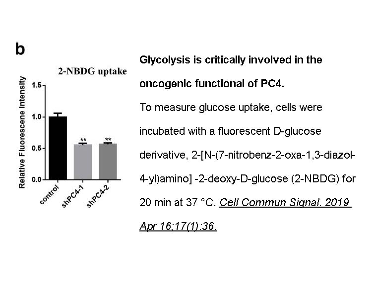 2-NBDG 是一種螢光標記的 2-脫氧葡萄醣(2-deoxy-glucose)類似物(analog),可用作評估細胞葡萄糖代謝(cellular glucose metabolism)的示蹤劑(tracer)。葡萄糖(Glucose)是維持組織中細胞活動(cell activities)和恆定狀態(homeostasis)的必要能量來源。糖代謝(Glucose metabolism)是許多疾病的重要靶標,並隨著病理狀況(pathological condition)而變化,因此,對糖代謝(glucose metabolism)的評估可以成為疾病進展的重要指標。2-NBDG可用於多種體外細胞 (10uM),如HepG2人肝癌細胞(HepG2 human hepatocarcinoma cells)、L6大鼠骨骼肌細胞(L6 rat skeletal muscle cells)、MCF-7乳腺癌上皮細胞(MCF-7 breast cancer epithelial cells)和星形膠質細胞(astrocytes),也用於疾病模型(disease models)、癲癇大鼠(epilepsy rat)、高血糖(hyperglycemia)、糖尿病(diabetes)或小鼠癌症異種移植模型(mouse xenograft model of cancer)。