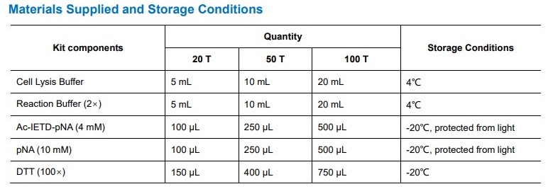| Kit components | • Cell Lysis Buffer • Reaction Buffer (2×) • Ac-IETD-pNA (4mM) • pNA(10mM) • DTT (100×) |