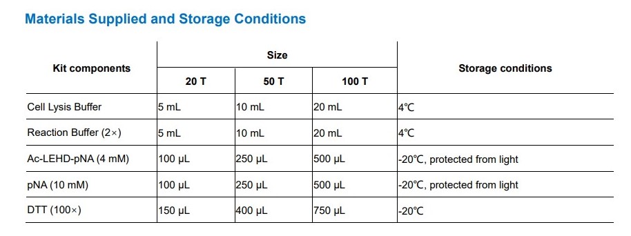 | Kit components | • Cell Lysis Buffer • Reaction Buffer (2×) • Ac-LEHD-pNA (4mM) • pNA(10mM) • DTT (100×) |