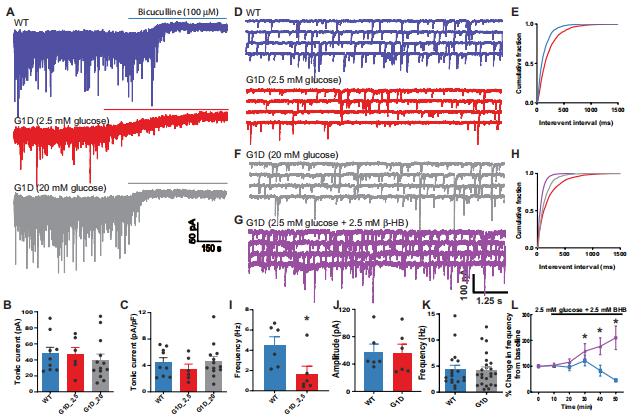 患有 I 型葡萄糖轉運蛋白缺乏症 (G1D) 的人習慣性地經歷與腦葡萄糖降低相關的營養反應性癲癇。然而,在 G1D 背景下血糖濃度與大腦興奮性之間的機制關聯仍有待闡明。美國德克薩斯大學西南醫學中心神經病學系罕見腦部疾病項目 Juan M. Pascual 和他的團隊對 G1D 小鼠使用 18F-脫氧葡萄糖正電子發射斷層掃描 (18F-DG-PET) 和質譜分析,結果顯示腦葡萄糖和糖原減少,但保留了三羧酸循環中間體,表明沒有整體能量代謝衰竭[2]. 在這些動物的腦切片中,皮質錐體神經元和丘腦中繼神經元的突觸抑制減少(圖 2),並且神經元去抑制被代謝的碳源減輕;α -amino-3-hydroxy-5-methyl-4-isoxazolepropionic acid (AMPA) 受體抑制也抑制了強直陣攣發作。這些結果表明 G1D 是一種丘腦皮質突觸去抑制疾病,與葡萄糖依賴性神經元興奮性增加有關,可能與糖原減少有關。