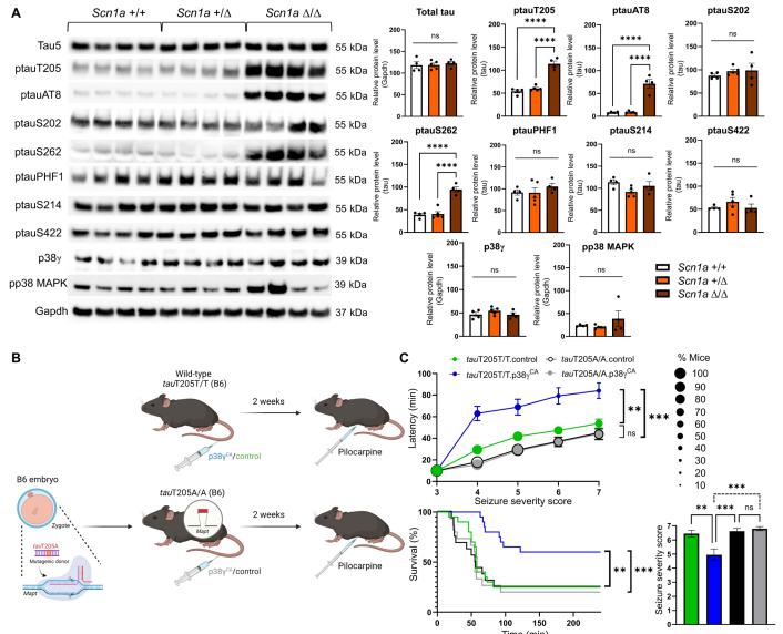 先前的研究表明,激酶 p38γ 對蘇氨酸 205 (T205) 的 tau 蛋白進行位點特異性磷酸化,可使 tau 蛋白脫離毒性途徑,從而在阿爾茨海默病中發揮神經保護作用。為了探究這種突觸後 tau/p38γ 相互作用在癲癇中的機制相關性,澳大利亞麥格理大學醫學、健康與人文科學學院麥格理醫學院癡呆症研究中心 Lars M. Ittner 及其團隊 生成了兩個癲癇小鼠模型:嬰兒發作性癲癇性腦病 Dravet 綜合徵 (DS) 的遺傳模型和化學誘導的癲癇小鼠模型,用於研究急性和慢性癲癇發作的影響[3]。在不同的癲癇小鼠模型中使用病毒介導的基因傳遞方法, 他們 表明,p38γ 活性增強治療可降低癲癇發作的易感性,恢復神經元放電模式,減少行為缺陷,並改善癲癇引起的死亡。此外,他們 表明,p38γ 介導的 T205 處 tau 磷酸化對於癲癇中的這種保護至關重要 (圖 3),因為缺乏這種關鍵相互作用會恢復病理特徵並加速體內癲癇。因此,他們的 工作為利用 p38γ 作為適用於急性神經系統疾病的未來療法提供了一個範圍。