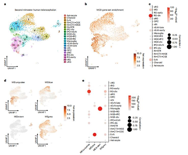 圖 1 單核轉錄組顯示 MCD 基因在發育中的人類皮層中的放射狀膠質細胞和興奮性神經元中富集