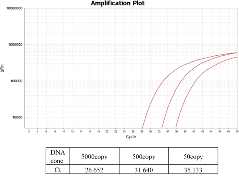 The SARS-CoV-2 nucleocapsid (N1) gene with serial diluted DNA template concentrations are prepared and conducted by qPCR. Based on the detected N1 probe fluorescence values, the result shows the Ct values corresponding to the different concentration.