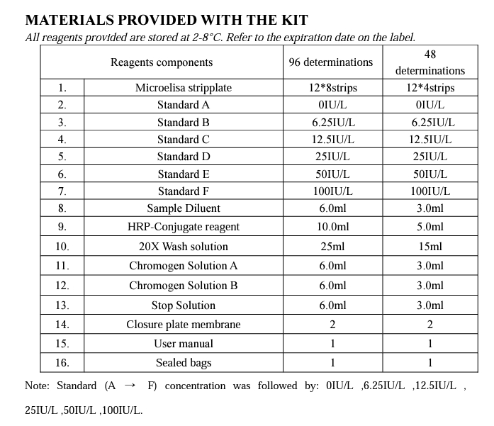 產品描述:該試劑盒用於人類促黃體激素 (LH) 水平,基於雙重原理(sandwich technology)抗體夾心技術酶聯免疫吸附試驗(enzyme linked immunosorbent assay , ELISA)。將標準品(Standard)和Sample 加入到預先包被有目標抗體的孔中,然後加入HRP-Conjugate 試劑形成免疫複合物,孵育,通過孵育和洗滌,去除未結合的酶,然後加入底物A和B,溶液會轉藍色,最後在酸的作用下變成黃色。顏色深度或光是與人類促黃體激素 (LH)濃度呈正相關。偵測範圍:5IU/L -100IU/L, 最低靈敏度1.0IU/L。可應用於以下樣品來源:血清(Serum)、血漿(plasma)、尿液(urine)、唾液(saliva)、組織勻漿(tissue homogenates)、細胞裂解物(cell lysates)、細胞培養物上清液(cell culture supernates)和其他生物體(biological fluids)液。