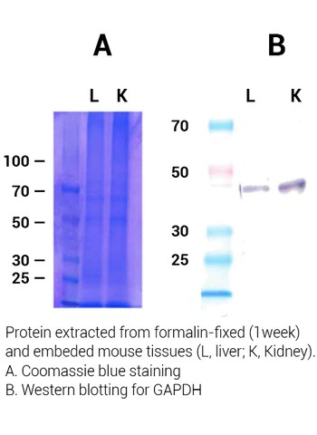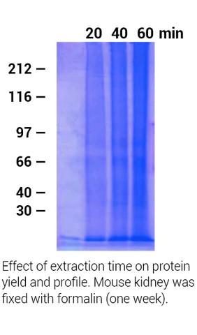 Formalin-fixed and paraffin-embedded (FFPE) tissues are widely available and serve as a potentially rich source for biomedical research. However, protein extraction from FFPE tissue is very challenging due to formalin-mediated molecular cross-linking. Traditional methods for protein extraction from FFPE tissues involve repeated deparaffinization and rehydration using organic solvents followed by protein extraction at a high temperature with or without an optional sonication step. These methods can be effective but are tedious and time-consuming (3-4 hours). Minute™ Protein Extraction Kit for Fixed and Embedded Tissues provides a simple and rapid way to extract protein from FFPE tissue without organic solvent deparaffinization. The whole procedure can be completed in less than one hour with a protein yield of 2-3 mg/ml.