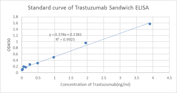 曲妥珠單抗(Trastuzumab)的商品名為赫賽汀(Herceptin),是 FDA 批准的用於 HER2 靶向治療乳腺癌的藥物。它是一種重組人源化單克隆抗體(IgG1 kappa)。曲妥珠單抗與 HER2 陽性腫瘤細胞表面的 HER2 受體結合,抑制細胞生長和增殖。抗曲妥珠單抗抗體 (15H2),單克隆抗體,小鼠,由雜交瘤產生,該雜交瘤是通過曲妥珠單抗免疫小鼠獲得的伴侶細胞與 B 淋巴細胞融合而產生的。該產品專門用於曲妥珠單抗。建議使用該抗體作為藥代動力學 (PK) 橋接測定中的檢測抗體,使用捕獲抗體 GenScript、A02032-40 抗曲妥珠單抗抗體 (11C4)、mAb、小鼠。The product is specific for Trastuzumab. The antibody is recommended as a detection antibody in a pharmacokinetic (PK) bridging assay with capture antibody GenScript, A02032-40 Anti-Trastuzumab Antibody (11C4), mAb