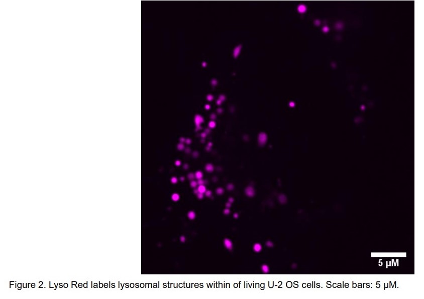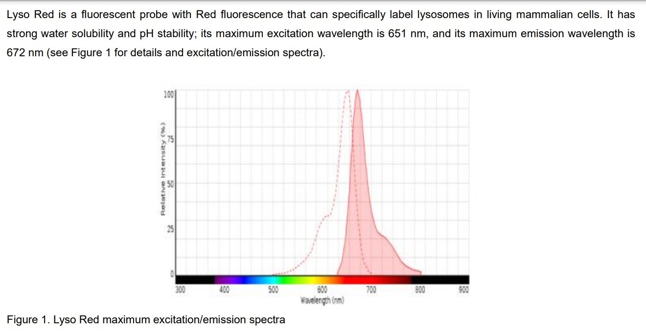 | Features & Benefits | • Optimized staining protocol for labeling Lysosome in mammalian living and fixed cells. The product has been tested in U2OS, Hela, COS-7 and ARPE cell lines. If the sample type is not included in the above cell lines, we can provide experimental services for specific cell lines. • Especially suitable for Confocal and long-term super-resolution imaging (such as SIM, TIRF, STORM and PALM). • Proprietary LysRed™ (Ex/Em = 650/665nm)-high specificity, low background and excellent photostability. • Low levels of cytotoxicity. |