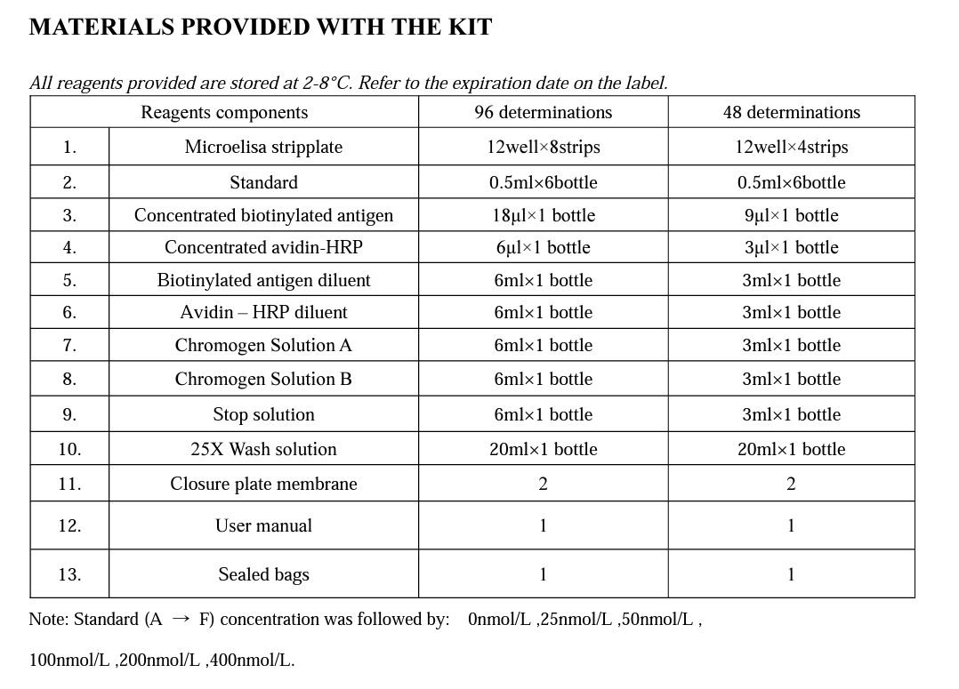 Note: 提供己配製好的標準品6瓶 Standard (A → F) concentration was followed by: 0nmol/L ,25nmol/L ,50nmol/L ,100nmol/L ,200nmol/L ,400nmol/L.