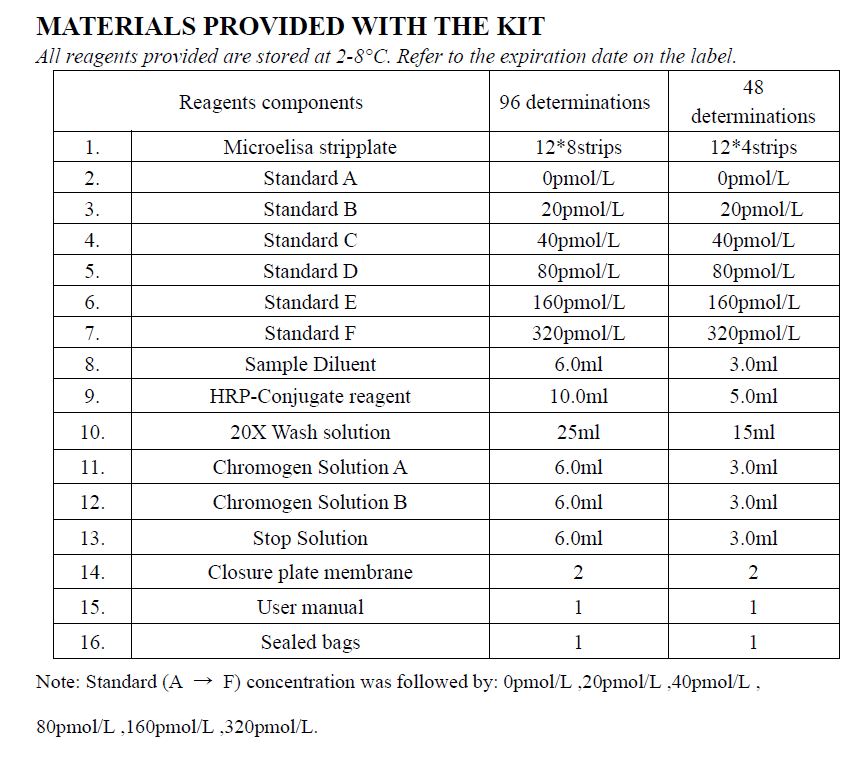 Note: 提供己配製好的標準品6瓶 Standard (A → F) concentration was followed by: 0pmol/L ,20pmol/L ,40pmol/L ,80pmol/L ,160pmol/L ,320pmol/L