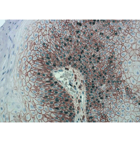 Mouse anti-CD44 clone SFF-304 and mouse anti-Ki-67 clone MIB-1 with Rabbit anti-Mouse Linker (Cat. No. ENZ-ACC116) was used with MULTIVIEW® PLUS (mouse-HRP/rabbit-AP) Kit (Prod. No. ENZ-KIT181) to perform multiplex immunohistochemistry staining with hematoxylin used as a counterstain. Tissue used is human buttock.