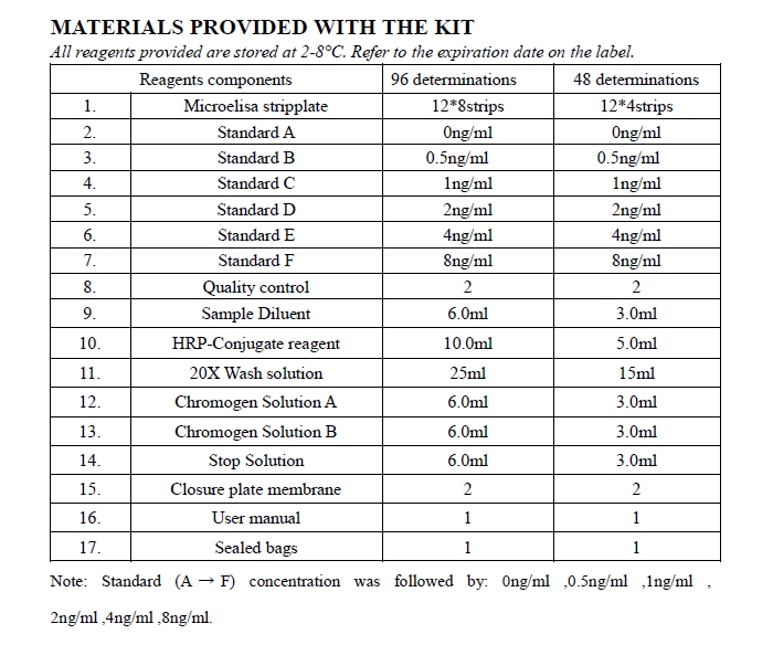Note: 提供己配製好的標準品6瓶 Standard (A → F) concentration was followed by: 0ng/ml ,0.5ng/ml ,1ng/ml , 2ng/ml ,4ng/ml ,8ng/ml.