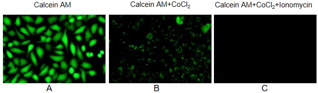 Fig. L929 cells was incubated with L929 cells Calcein AM (1X), and the cytoplasm including mitochondria emitted strong green fluorescence (A). After cells were further incubated with CoCl2 (1mM), the green fluorescence of Calcein in the cytoplasm was quenched by CoCl2, leaving only the green fluorescence in mitochondria (B). Cells treated with Ionomycin (0.25μM) induced a large amount of extracellular Ca2+ into the cell, excessive Ca2+ into the mitochondrial matrix, resulting in the opening of MPTP, partial release of Calcein from the mitochondria, and the introduction of cobalt ions into the mitochondria and green fluorescence quenching of Calcein (C).