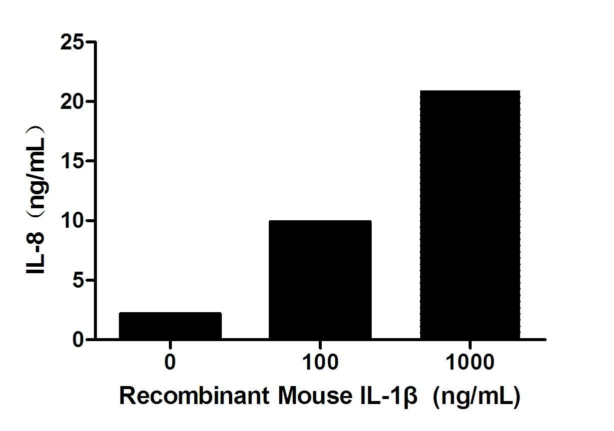 Interleukin 1 beta (IL-1β) also known as leukocytic pyrogen, leukocytic endogenous mediator, mononuclear cell factor, lymphocyte activating factor and other names, is a member of the interleukin 1 family of cytokines. This cytokine is an important mediator of the inflammatory response, and is involved in a variety of cellular activities, including cell proliferation, differentiation, and apoptosis. It has been reported that IL-1β can induced IL-8 production in A549 cells. To test the bioactivity of IL-1β, A549 cells were seeded into 24-well plate at a density of 1×106 cells/mL, and allowed to attach overnight before treated with certain concentrations (0.1ng/mL-1000ng/mL) of IL-1β for 24h and IL-8 levels in the cell supernatant were determined by ELISA. IL-8 levels in the cell supernatant of A549 cells increased significantly after stimulated with IL-1β have shown in Figure1.