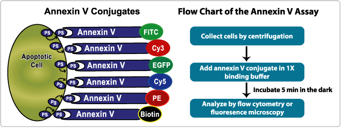 細胞凋亡是指為維持有機體內環境穩定,由基因控制的細胞自主的有序的死亡。正常情況下,任何細胞在形成過程中發生的異常都會通過凋亡消除。例如,體內的癌細胞增長為腫瘤的過程會受細胞凋亡的引導而被抑制。然而,在抑癌基因p53出現問題時,凋亡就不會誘導發生,從而導致癌細胞的不斷增長。細胞凋亡可以通過細胞形態的變化或生物化學的變化來檢測。目前常用的指標有caspase活性分析、DNA片段分析、及磷脂醯絲氨酸phosphatidylserine (PS)的外翻等。Annexin V細胞染色,用於檢測細胞凋亡早期的細胞膜變化。在細胞凋亡早期,膜磷脂醯絲氨酸phosphatidylserine (PS)由脂膜內側翻向外側。Annexin V是一種Ca離子依賴性磷脂結合蛋白,可以與磷脂醯絲氨酸phosphatidylserine (PS) 特異結合。用綠色螢光FITC標記的Annexin V通過流式細胞儀或螢光顯微鏡可以檢測到細胞凋亡的發生。碘化丙啶(Propidium Iodide, PI)是一種核酸染料,PI只能透過凋亡晚期和死細胞的細胞膜,因此Annexin V和PI結合使用,可以區分凋亡早晚期的細胞及死細胞。另具有不同螢光之選擇 (FITC, -Cy3, -Cy5, -EGFP, -PE, -Biotin)