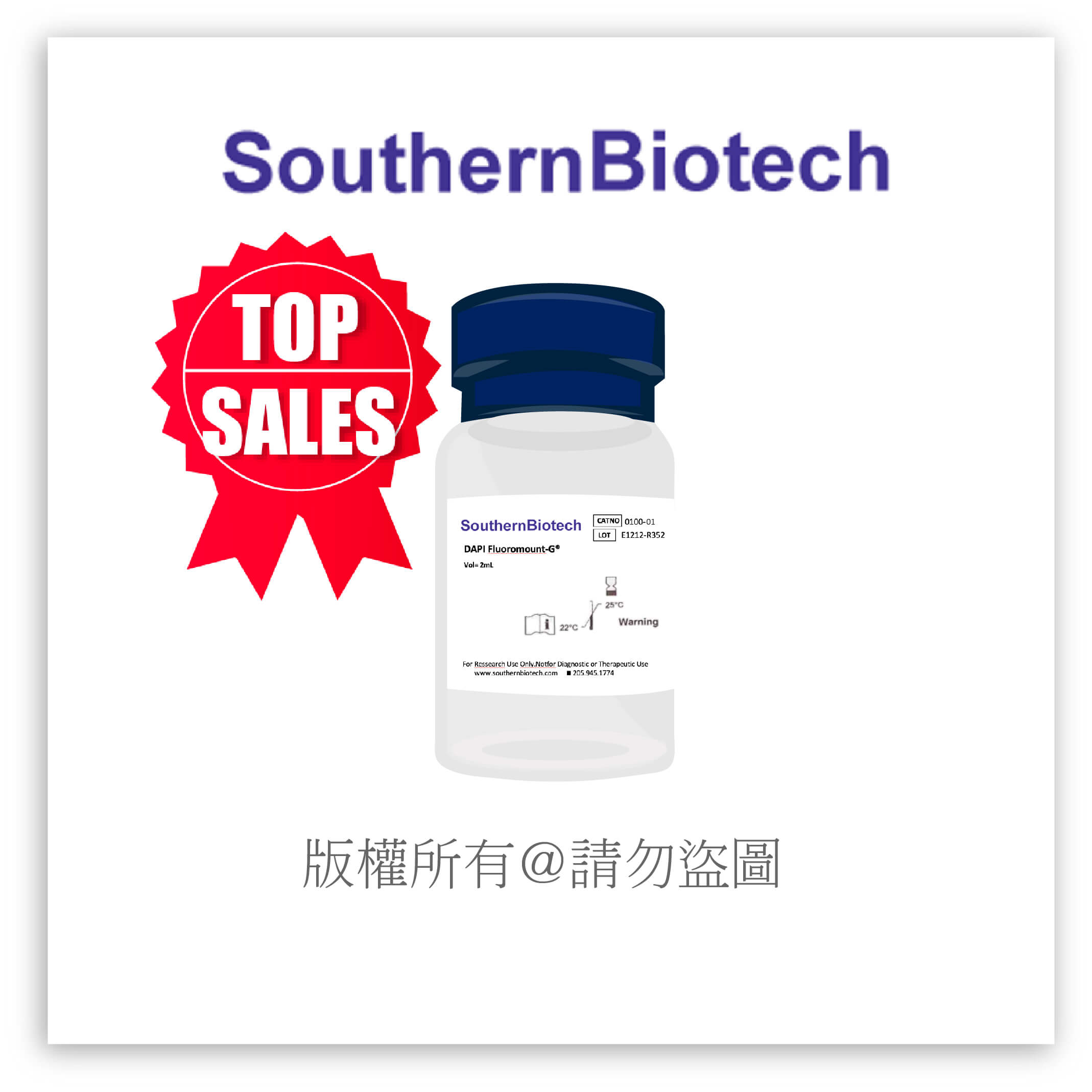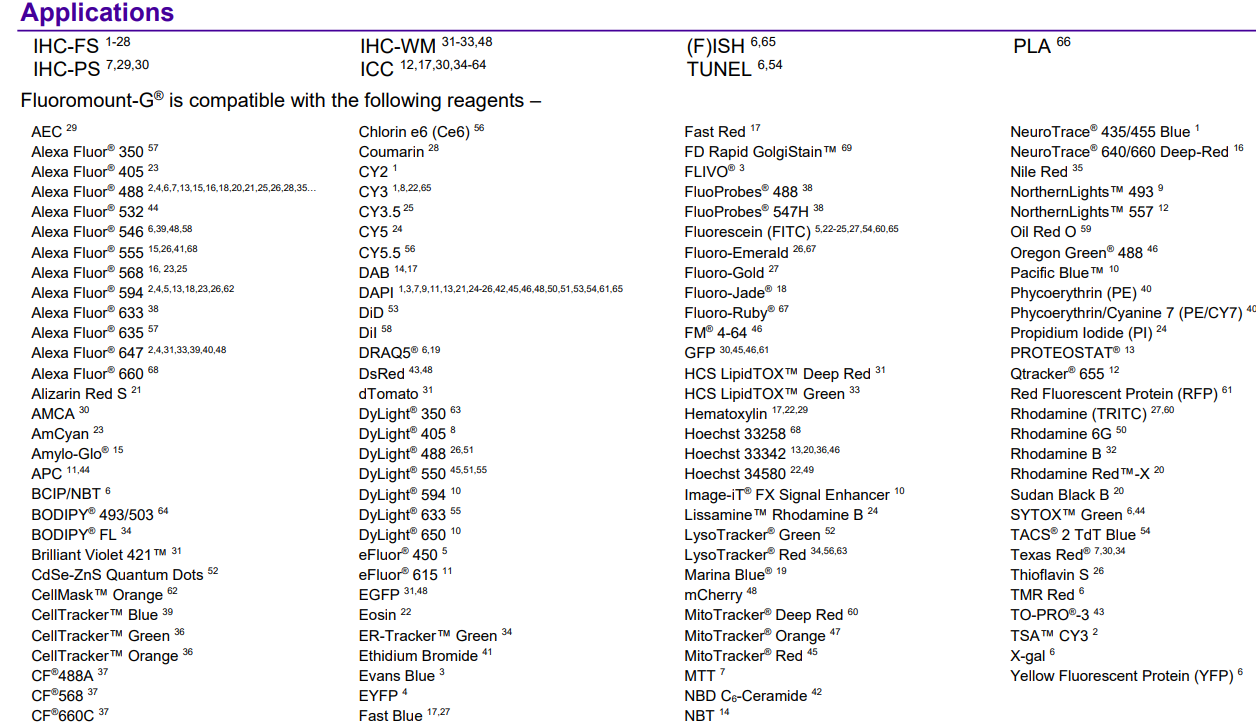 Fluoromount-G® (Clear liquid mounting medium) Fluoromount-G抗螢光淬滅封片劑是一種不含有螢光探針的水溶性封片劑,內含螢光保護劑,可大幅減緩螢光分子氧化褪色的情形。用來對最後一步染色是在水溶液體系中完成的玻片樣本進行封片,可以顯著減緩各種常見螢光染料的螢光。SouthernBiotech(SBA) Fluoromount-G系列螢光封片劑、抗淬滅封片劑,操作簡便用於長時間保存玻片,有一定抗淬滅作用,適用組織切片、細胞塗片/爬片等實驗。提供半永久性密封。據報導,Fluoromount-G® 的折射率為約為 1.4 70。Fluoromount-G®提供二種型式之螢光封片劑 (貨號#0100-01)、與含有DAPI染劑之DAPI螢光封片劑 (貨號#0100-20)。