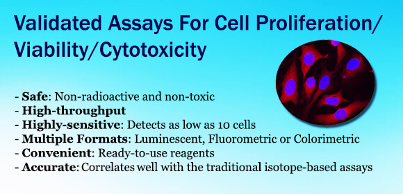 WST-1 Cell Proliferation Colorimetric Assay Kit WST1細胞活性分析呈色套組 (貨號K301-500);快速細胞增殖分析,使用水溶性tetrazolium鹽類的的WST-1作為染劑,利用粒腺體中的脫氫酶還原成橙色產物。WST-1比 起傳統的MTT、XTT或是MTS-base分析要來的更快速且靈敏度更高。| 細胞老化分析套組|Senescence Detection Kit: 細胞老化被認為是抑制癌細胞的機制,因此當細胞老化時雖然細胞會持續存活,但是在這個階段的細胞是不會分裂,也無法以血清及培養基進行細胞繫代培養。Senescence detection kit是偵測切片中組織或細胞上 特定的senescence marker,而這些marker是不會出現在其他的細胞中。|生物冷光細胞毒性分析套組 | Bioluminescence Cytotoxicity Assay Kit: 這套細胞毒殺試劑組是透過受損傷的細胞釋放Adenylate Kinase (AK),利用AK將phosphorylates ADP 轉化為 ATP,產生的 ATP 能夠參與 Luciferase 冷光反應,再透過冷光偵測儀偵測結果,每次分析只要 10 個以上細胞就能分析,而且只要10分就能得到結果。| LDH細胞毒性分析套組 |LDH-Cytotoxicity Assay Kit: 這個試劑組是透過偵測乳酸脫氫酶(lactate dehydrogenase, LDH)活性判斷細胞毒殺現象。LDH存在於所 有細胞中,當細胞破裂時才會釋放至細胞外。使用LDH-cytotoxicity assay kit只需要分光光度計500nm 波長的區段,避閧放射線分析方法,可用於貼附型或懸浮型細胞培養液。操作時間大約30-60分鐘。|死活細胞染色 | Live-Dead Cell Staining Kit: Live-Dead Cell Staining Kit是ready-to-use的試劑,裡面含2種不同波長的染劑,包括染活細胞的Live -dye (綠螢光,Ex/Em = 490/515 nm)以及染死細胞的propidium iodide (PI,紅螢光,Ex/Em = 488/615 nm),細胞經過染色後,能夠直接在螢光顯微鏡下觀察細胞存活的狀況。