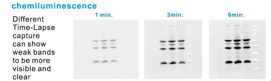 多功能螢光冷光影像系統 曝光時間:單一張影像擷取最低可設至0.001 秒, 最高可設至100,000 秒以上(>24小時)