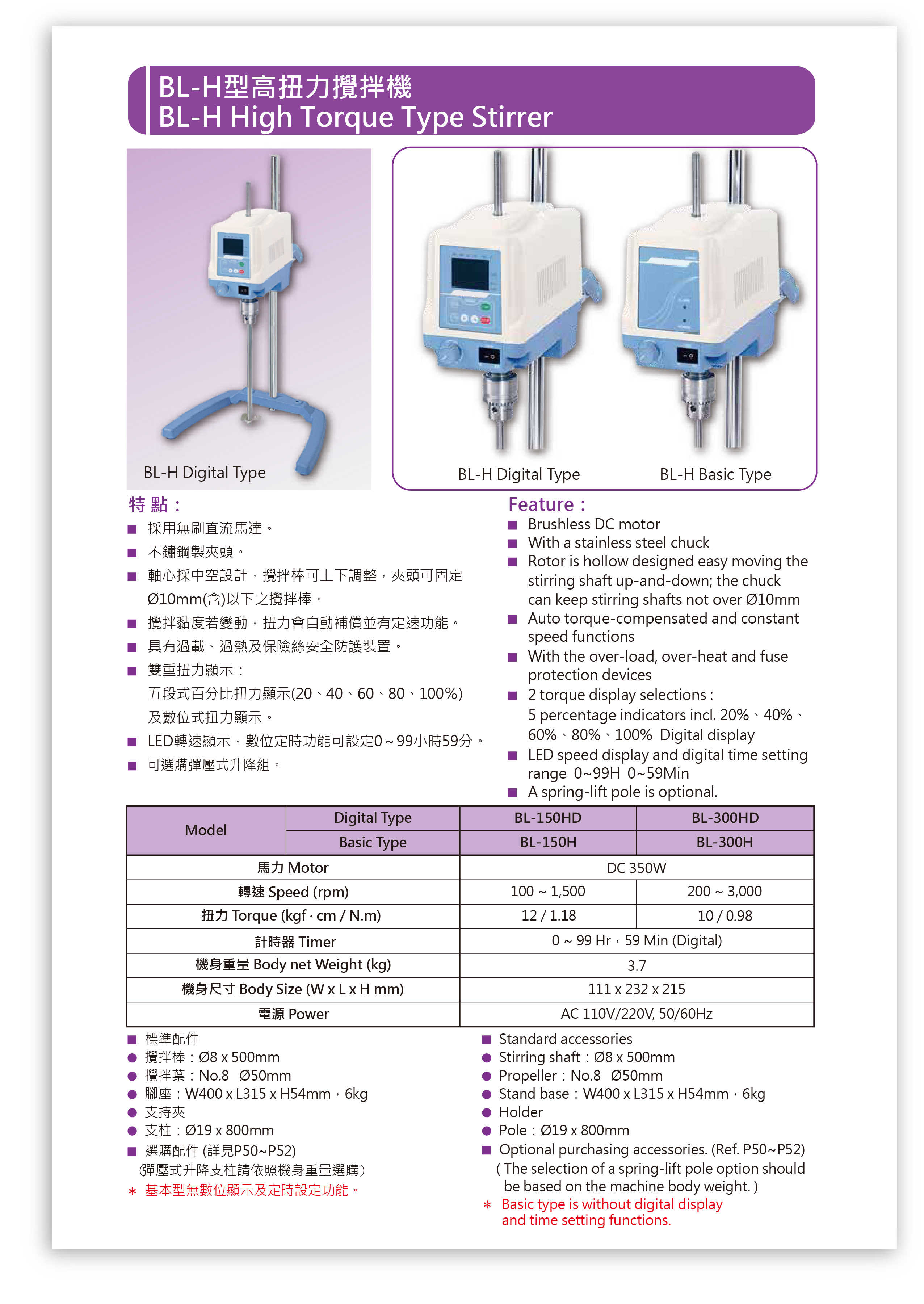 數位型攪拌機 BL-H 採用無刷直流馬達、100-3000rpm、10-12kg/cm、馬力 350W。不鏽鋼製夾頭,攪拌黏度變動時自動補償扭力、並有定速功能。具有過載、過熱安全防護。數位型具備:雙重扭力顯示 (百分比及扭力值顯示)、LED 轉速顯示、99h59m 數位定時。