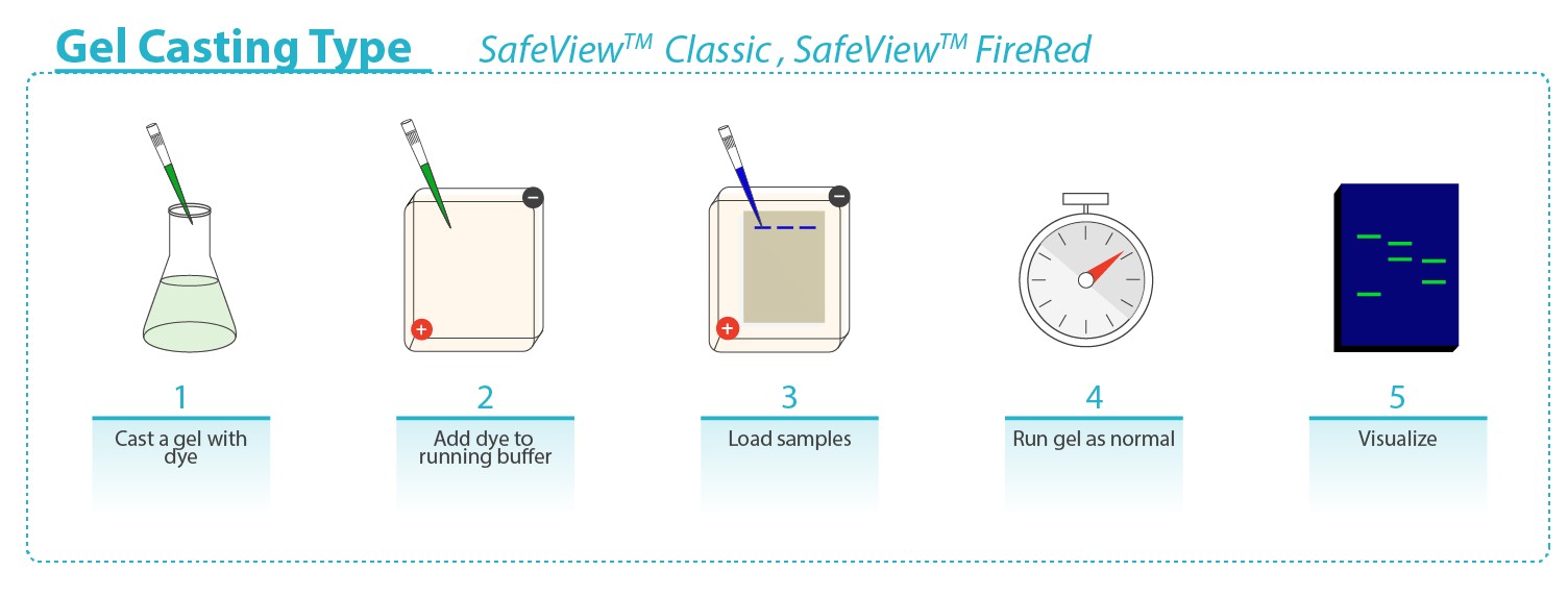 (內染) SafeView™ Classic、FireRed使用方法100ml agarose溶液中加入5ul SafeView™ Classic 後製膠。SafeDye (是loading dye也是DNA染劑)系列產品包括:Safe-Green、Red、White、Pack (loading dye染劑),使用方法為跑電泳時將maker與樣本中加入SafeView™ dye (1:5倍稀釋),是一種快速染核之loading dye,不需將膠體預染或外染。(外染) SafeView Plus™-作為外染使用。不需退染步驟。靈敏度更佳。SafeView Plus™:DNA電泳完成後,將膠體泡入含有SafeView Plus™的電泳緩衝液(1:10,000稀釋),室溫下反應10-40分鐘即可進行偵測。