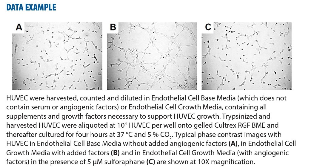 Cultrex 體外血管生成檢測管形成試劑盒(The Cultrex in vitro Angiogenesis Assay Tube Formation Kit, 3470-096-K) 開發用於評估內皮細胞管形成(endothelial cell tube formation)的誘導劑和抑制劑。在測定過程中,在血管生成調節劑存在的情況下,將內皮細胞(endothelial cells )接種在基底膜提取物(Basement Membrane Extract)的厚凝膠上。如果培養基允許血管生成反應,細胞將在數小時內自行組裝成管網(tube networks);如果介質中有抑制劑( inhibitors),管網形成(network formation )將不完整或不存在。在西蘭花和其他十字花科蔬菜中發現的蘿蔔硫素 [1- 異硫氰酸基-(4R)- 甲基亞磺酰基)-丁烷] 是一種天然存在的癌症化學預防劑,並作為對照抑制劑提供以可視化該過程。內皮細胞可以使用 Calcein AM 進行螢光標記,並且可以分析使用顯微鏡相機捕獲的圖像以量化血管生成反應。 Cultrex 體外血管生成檢測試劑盒提供了一種經濟高效的方法,用於研究 96 孔板形式的預期血管生成抑制劑。