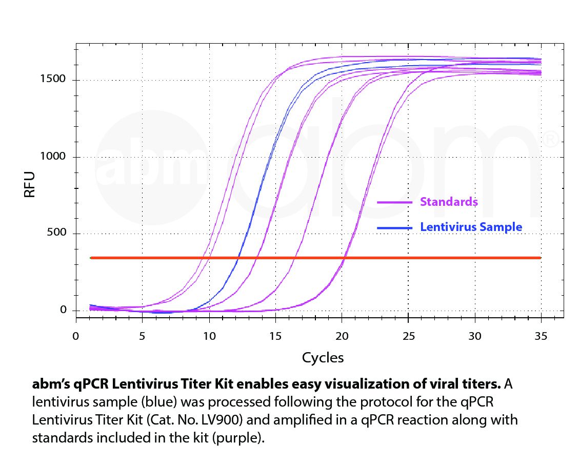 Abmgood提供快速且方便之Lentivirus病毒力價定量套組 (abm’s qPCR Lentivirus Titer Kit, LV900);不需要額外的裂解或逆轉錄(reverse transcription , RT)步驟,並且可以在一小時內完成Lentivirus病毒力價定量。Abm的BlasTaq™DNA聚合酶具有先天的RT活性,因此無需添加RTase或額外的RT孵育步驟。與市場上的同類試劑盒相比,該試劑盒旨在提供高靈敏度和特異性,可確保最小的非特異性背景和更好的整體性能。2021年後包裝提供qPCR MasterMix + ROX,以支持各種qPCR機器的使用。(舊包裝需單獨購買2X qPCR MasterMix)。