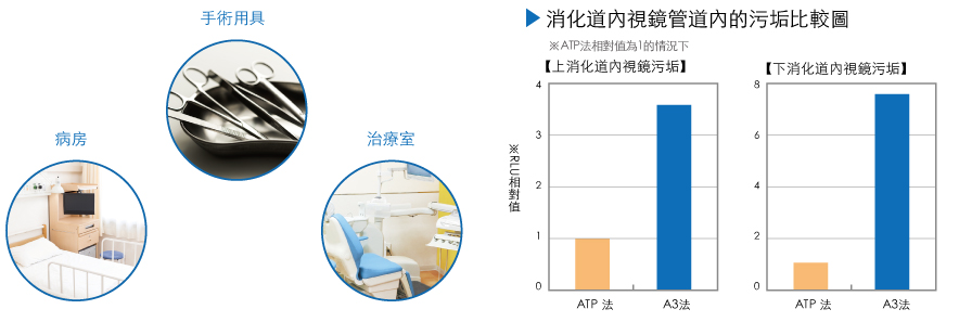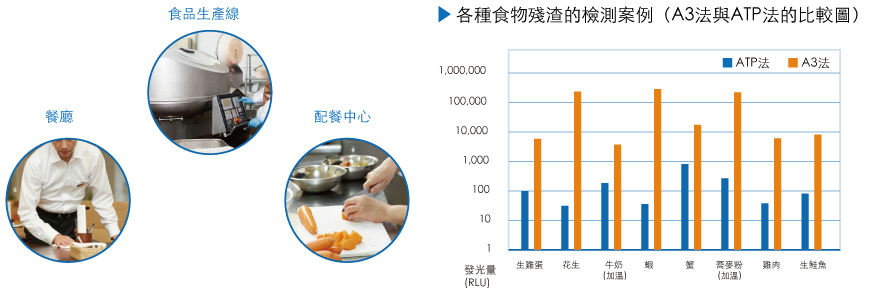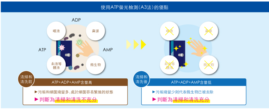 ATP螢光檢測(A3法)的檢查對象不僅針對細菌,還可檢測不在細菌檢查範圍內,但可引起細菌繁殖的食品殘渣、醫療現場污垢中的ATP+ADP+AMP量,是一種不僅能檢測ATP,還能檢測ADP、AMP 的高靈敏度檢測。