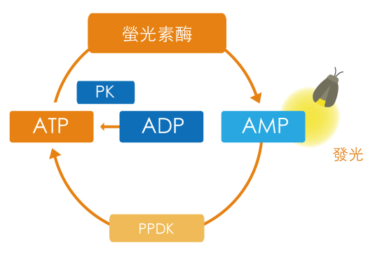 ATP螢光檢測(A3法)中的ATP與螢光素酶反應產生發光量,AMP與PPDK反應轉化成ATP,ADP與PK反應也轉化成ATP,A3法檢測的是ATP+ADP+AMP的總量。