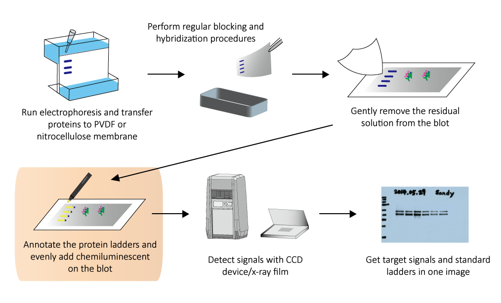 Figure 1. Use LuminolPen™ EZ to take notes and mark prestained protein marker on the blot