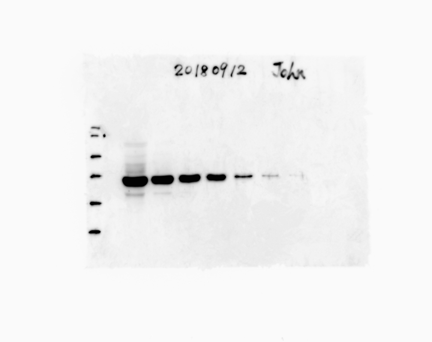 30 μg cell lysate SP-1 and detect with anti-ADNP (mouse, 1:2,000). Secondary antibody : anti-mouse IgG-HRP (1:15,000). Membrane : Hyond™ P. Detection : Hyperfilm™ ECL. Signal exposed for 30 seconds and detected by X-ray. The molecular weight note by LuminolPen™ reveal the correct target signal (ADNP 124KDa) on X-ray film.