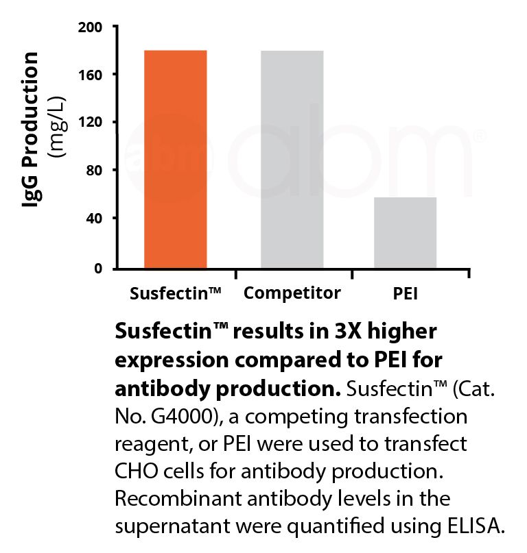 Get 3X higher expression compared to PEI Susfectin™ 是一種可生物降解(biodegradable)的基於聚合物(polymer-based)的轉染試劑(transfection reagent),用於轉染懸浮細胞(suspension cells)。 Susfectin™ 與 DNA 形成複合物(complexes),使 DNA 能夠轉運到各種懸浮細胞中。這種聚合物經過工程改造,可在轉染後(transfection)快速降解(rapidly degrade),使其對細胞的細胞毒性(cytotoxic)大大降低,並提高轉染效率(transfection efficiency)和轉基因表達(transgene expression)的生產力。 Susfectin™ 是生產抗體 (CHO) 和病毒 (293) 的理想選擇。可應用抗體的產製及病毒的產製。