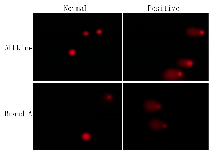 Fig.The Abbkine Comet Assay Kit was used to detect DNA damage in Jurkat normal cells and DNA damage induced positive control group. And it’s compared with other brand A. The fluorescence brightness and clarity detected by Abbkine Comet Assay Kit are higher than the other brand.